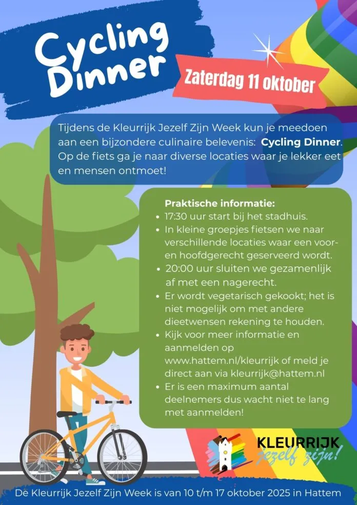 Tijdens de Kleurrijk Jezelf Zijn Week is er op 11 oktober een bijzondere culinaire belevenis: Cycling dinner. Op de fiets gaan Hattemers naar diverse locaties. Wytske Verschoor, beleidsambtenaar gemeente Hattem en mede-organisator: ‘Het idee achter een cycling dinner is andere mensen ontmoeten, verrassende gesprekken voeren en lekker eten. Je fietst van locatie naar locatie (eigen alternatief vervoer mag natuurlijk ook). Je kan je aanmelden als deelnemer of als kok.’