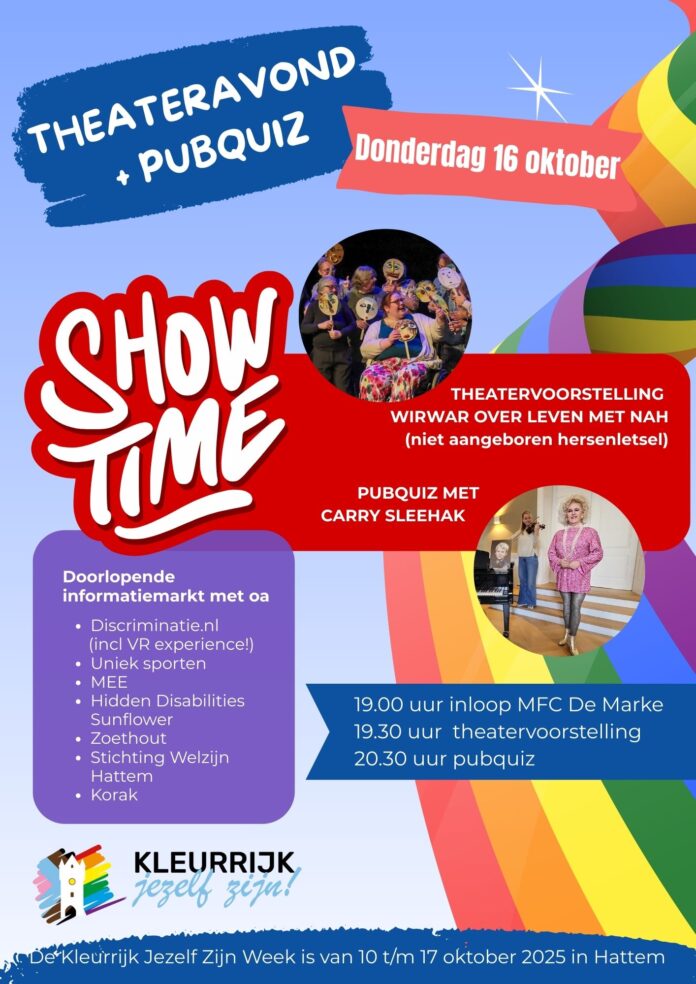 Op donderdagavond 16 oktober is er in MFC De Marke een bijzondere avond vol inspiratie, ontmoeting en bewustwording met een pubquiz, theater en een inspiratiemarkt. Deze avond maakt deel uit van de Kleurrijk Jezelf Zijn-week, waarin Hattem aandacht geeft aan inclusie, diversiteit en het recht om jezelf te zijn. De toegang is gratis, inclusief twee drankjes.