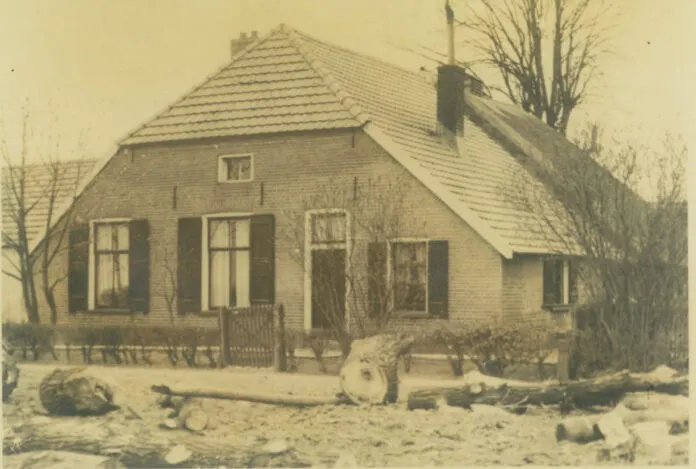 bijschrift foto: De huidige boerderij van de familie Poppe (hoefsmid) met de voorkant van het huis aan de Doornweg, waar de bomen in het land klaarliggen voor de te maken klompen in de klompenmakerij van Nagelhout.