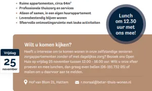Woonzorgcomplex Buitenhof Hattem is een kleinschalig complex en heeft appartementen verdeeld over twee woonlagen. Op de 1e etage kunt u zonder zorg of met een kleine zorgvraag geheel zelfstandig wonen. Naar wens kunt U tegen kosten gebruik maken van ons aanvullende servicepakket.