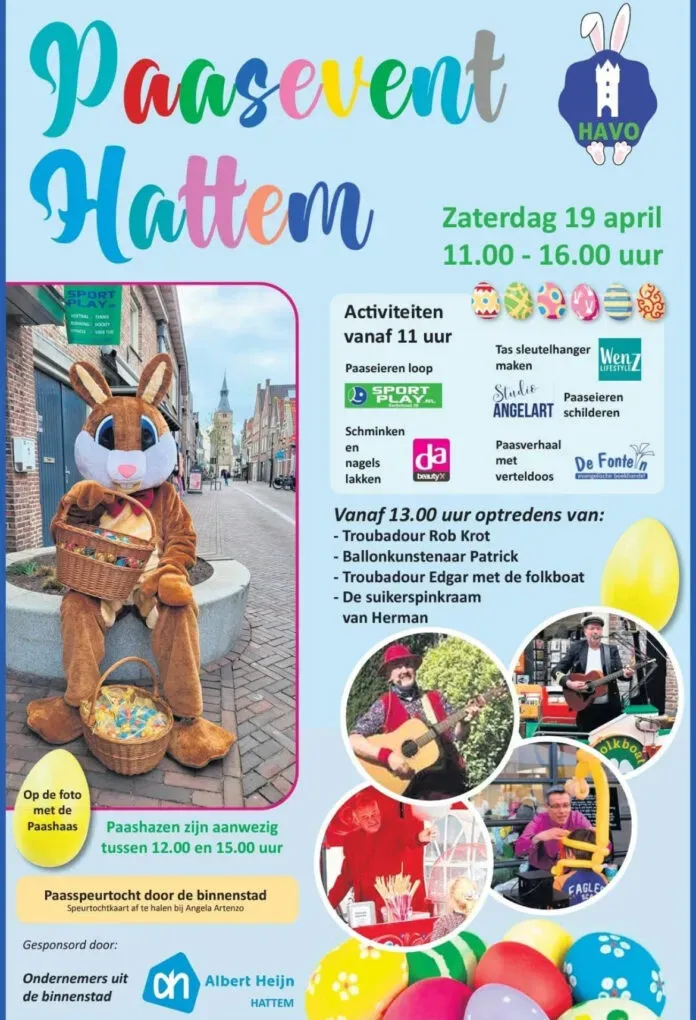Op 19 april organiseren de Hattemse ondernemers een paasevent. Op die dag is er een paasspeurtocht, kunnen er eieren worden gezocht en worden kinderen geschminkt. Twee paashazen maken het nog gezelliger door ‘s middags tussen 12 en 15 uur door de stad te lopen.