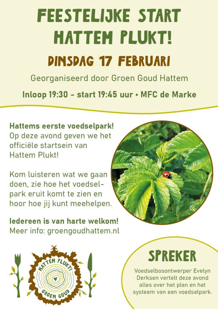 Op dinsdag 17 februari geeft Stichting Groen Goud Hattem het officiële startsein voor het project Hattem Plukt!. Tijdens een feestelijke bijeenkomst in de Marke, aanvang 19.45 uur, wordt het plan voor voedselpark Assenrade gepresenteerd door voedselbosontwerper Evelyn Derksen. De avond biedt inwoners een inkijkje hoe het eerste voedselpark van Hattem eruit komt te zien en welke planten en ideeën straks zichtbaar en eetbaar worden in het park.