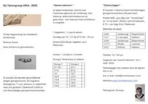 Om de zes weken begeleid Visser zowel op de zondagmorgen als op de zondagmiddag een groep. Op 8 december is weer een tekenles in het Molenhuis. Voor meer informatie: info@simonevisser.com