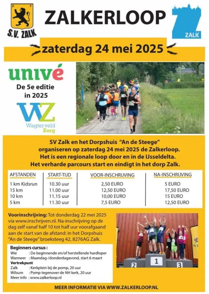 Zalk – SV Zalk en het Dorpshuis An de Steege organiseren op zaterdag 24 mei de Zalkerloop. Het is een regionale loop door en in de IJsseldelta. Het verharde parcours start en eindigt in Zalk.