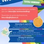 Samen met andere Hattemers op 30 september meewerken aan een kunstproject en daarbij gezellig samenzijn en elkaar ontmoeten kan tijdens een van de textielworkshops...